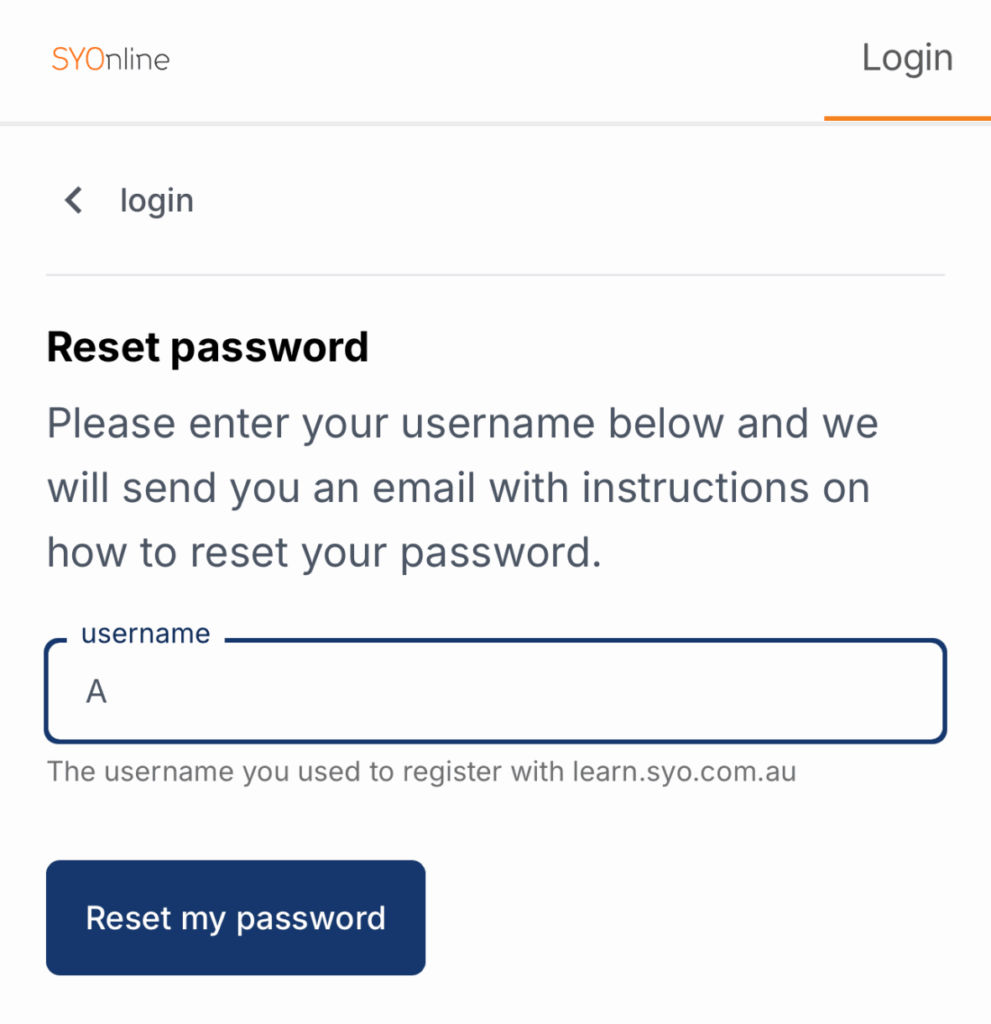 2. Enter the username provided to you in your ‘Welcome to SYO’ email. You should then receive an email with a link to set your password.