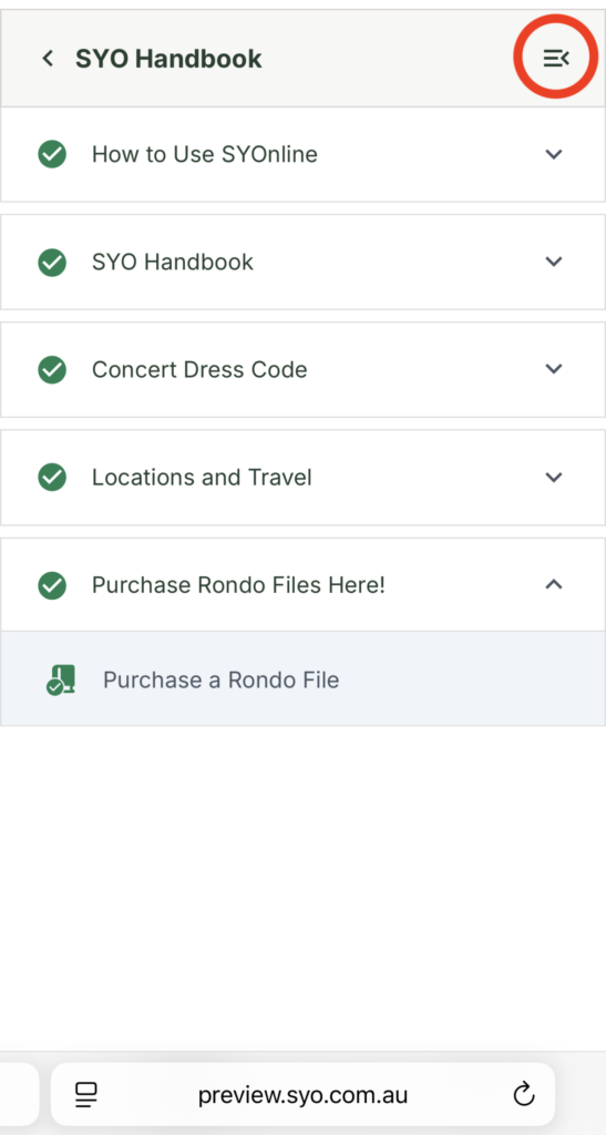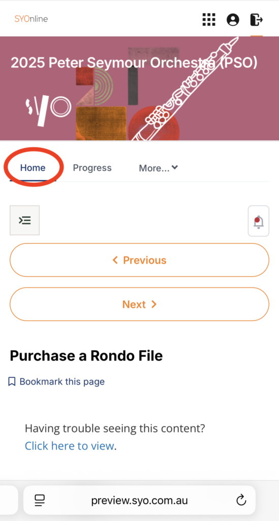 Once you are in your course, you be open to the contents of your homepage. Click the icon in the top right of your phone screen, then HOME to see the full homepage and navigate from here.