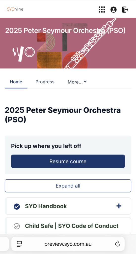 Once you are logged in you will see the SYOnline dashboard. It will have tiles for each course you are enrolled in.
