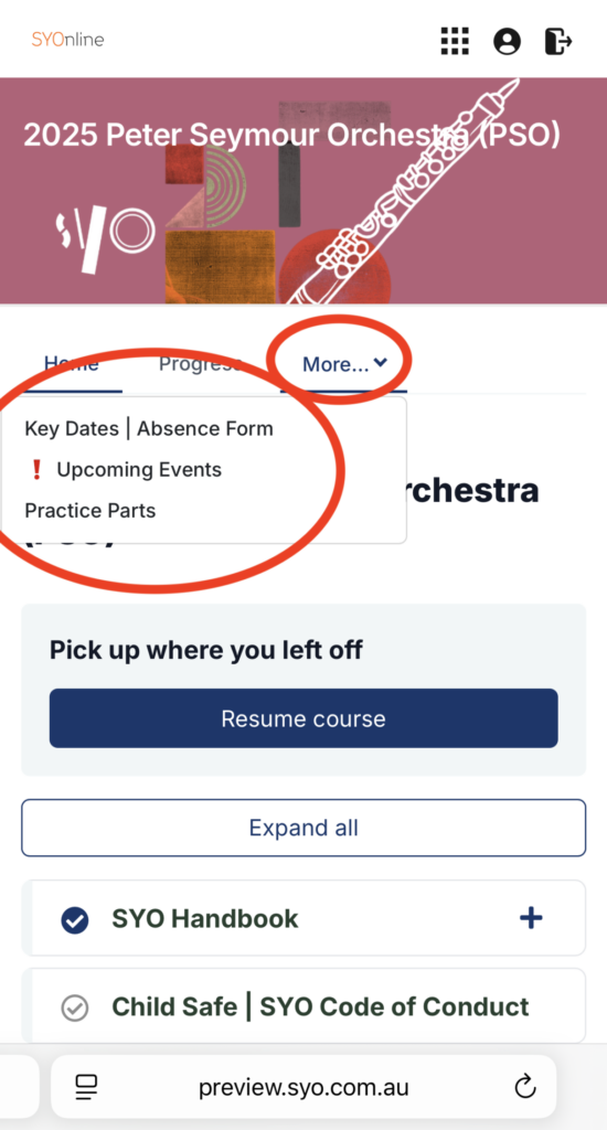 Along the main bar or under MORE (on a phone) you will find the Key Dates | Absence Form tab. All dates for the entire year can be found here! This includes rehearsals, concerts, tutorials and anything else relevant to your orchestras’ calendar.