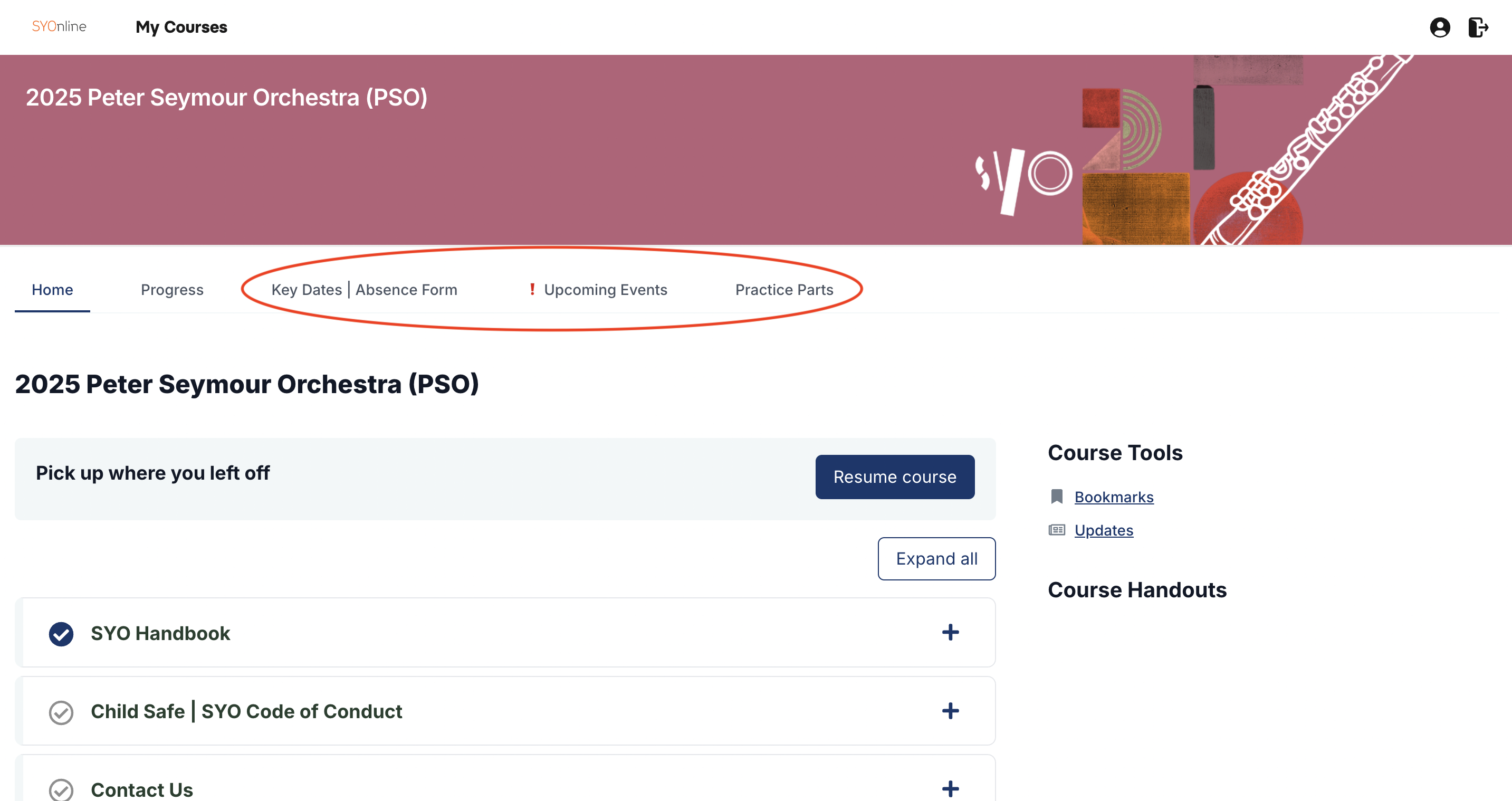 From your homepage you will be able to access: Updates, Key Dates, Attendance Requirements, the Absence Form, Practice Parts and Upcoming Events.