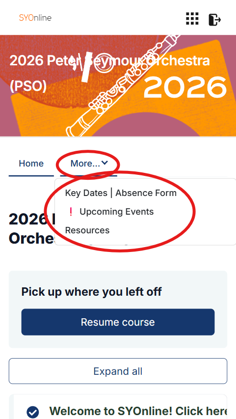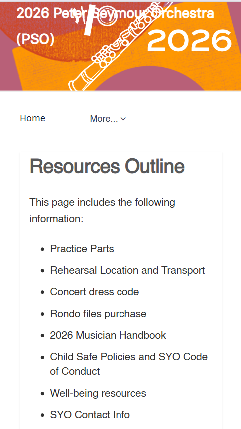 The ‘Resources’ page contains all additional information and documents you may need throughout the year. This page includes: practice parts, rehearsal location, concert dress code, Rondo File purchase, 2026 Musician Handbook, child safe policies and SYO Code of Conduct, well-being resources and SYO contact info.