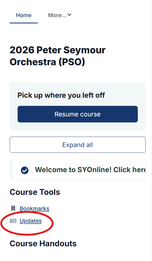 During the semester, you will periodically receive a notification via email letting you know that you have an update in SYOnline. You will find the update on your homepage under Course Tools. When prompted by an update, make sure you go to SYOnline to check for updates as they often contain important infrmation about the program.